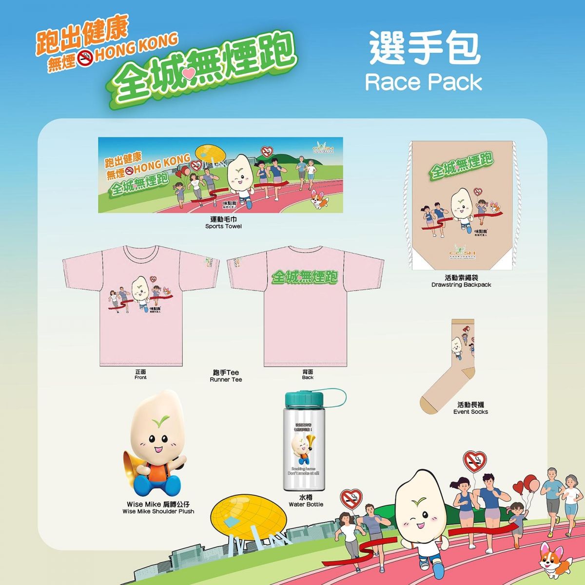 每位參加者將獲得選手包一份,包括「咪點我」索繩袋、運動T恤、號碼布連計時晶片、運動毛巾、運動襪、水樽、「咪點我」肩膊公仔及完成獎牌,希望各參加者能將無煙信息傳遞給參加者及其親朋好友。屆時,無煙代言人「咪點我」更會親身到場與大家見面及打氣!